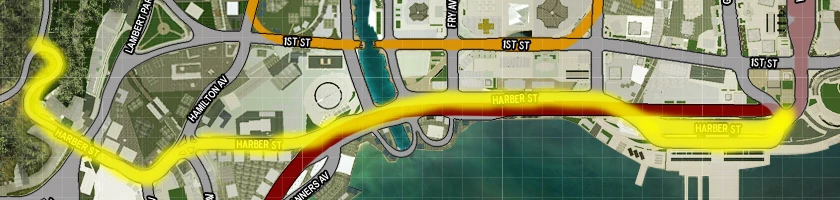Harber Street will be a road used very often in Race events as it offers players a direct itinerary to the Wildcats Baseball Stadium finishing place, it is also an unmissable road when traveling from Downtown to Harbor Town as the most used shortcut through the harbor warehouses is linked to this road. Stunt Run drivers will find worthwhile jumps and ramps along Harber Street and will have no trouble smashing through the various billboards on scattered along the road. The Marked Man event Mayday Mayday starting at the Manners Avenue intersection is easily completed thanks to the many shielded areas running parallel to the main road.