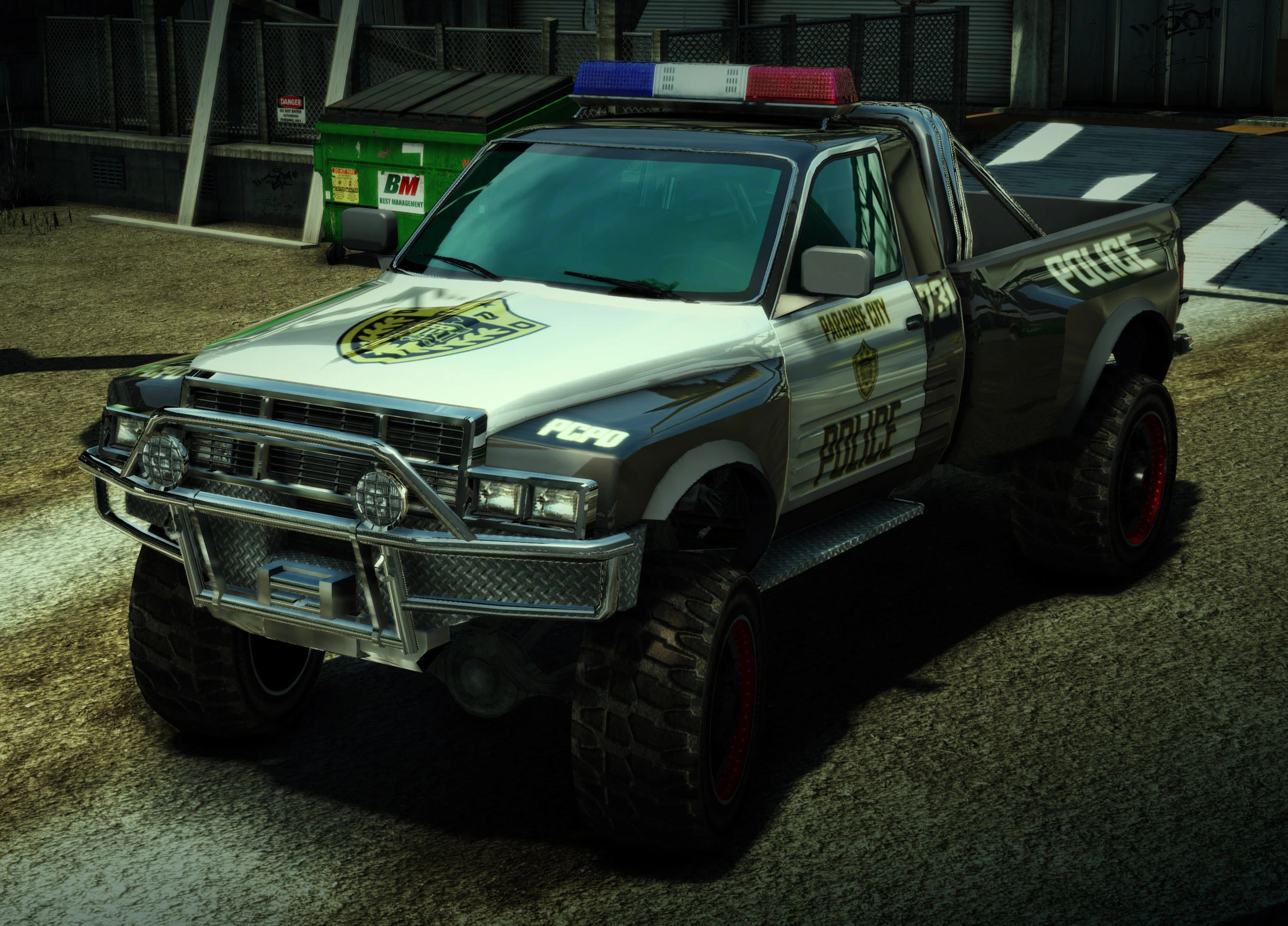The PCPD Takedown 4x4 mostly takes on the looks from a mid to late 90s' Dodge Ram but with a few modifications. The only difference from the original Takedown 4x4 is that it now has an older American style police livery with lights & sirens.